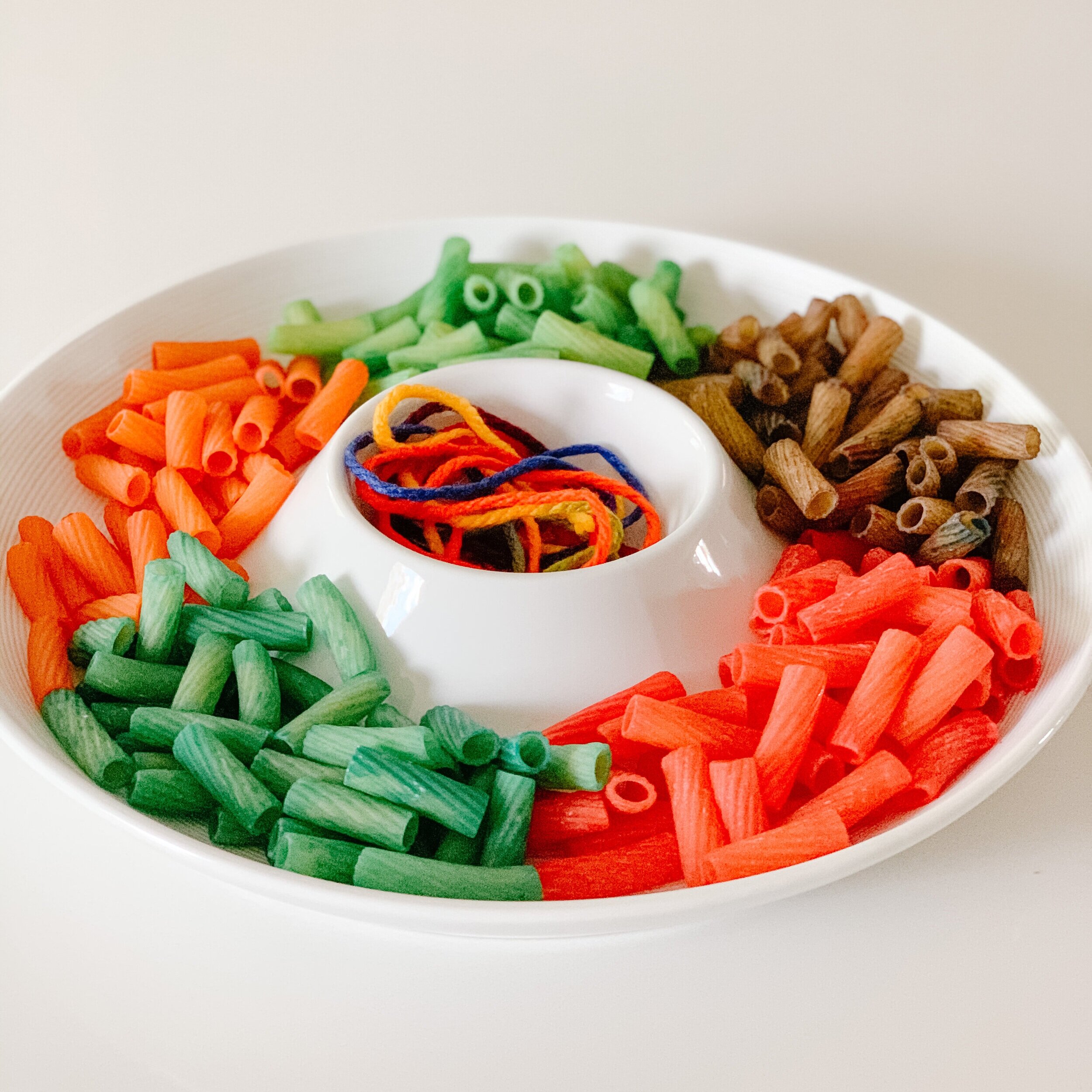 Children learn through play. It develops their creativity, fine motor and cognitive skills. What I love about this activity is that you can do so much more than simply thread pasta and make pretty necklaces (although that in and of itself has so many benefits). Think outside the box. Practice colours, make shapes and even do some math!